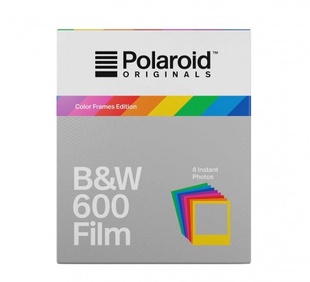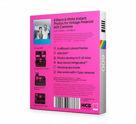 Carga de ocho fotos instantáneas en blanco y negro con marcos de distintos colores para las cámaras Polaroid vintage de tipo 600. Puede usarse con las nuevas OneStep y el Polaroid Lab, y está también disponible en color